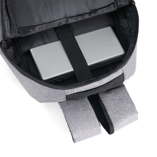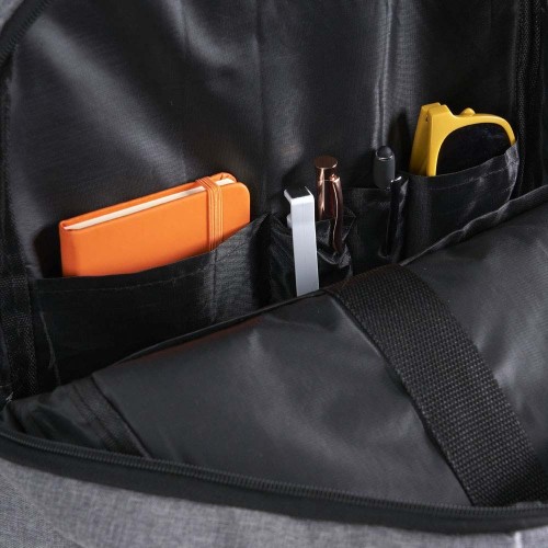 Descrição: Mochila confeccionada em nylon com compartimento para notebook até 15,6 polegadas. Contém compartimento grande com divisórias para documentos, eletrônicos e caneta, dois compartimentos frontais, sendo um com abertura horizontal, e outro com abertura vertical, bolso lateral e adaptador USB externo com cabo acoplado, permitindo a conexão de um carregador portátil de dentro da mochila e transferência da carga para o lado externo, ocultando o carregador e viabilizando a utilização do celular durante o processo. Contém zíperes com pegadores plásticos, alça de mão em nylon, alças para as costas ajustáveis com revestimento espumado antitranspirante e alça horizontal para encaixe em malas de viagem. Altura : 41 cm Largura : 30 cm Profundidade : 16,5 cm Medidas aproximadas para gravação (CxL): 11 cm x 22 cm Peso aproximado (g): 418