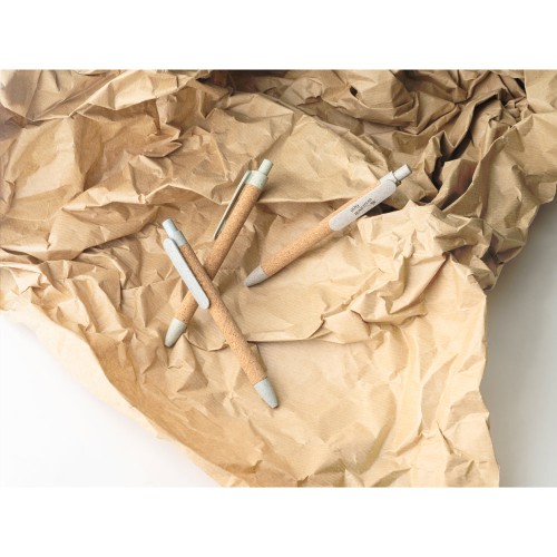 Esferográfica em cortiça com clipe e elementos coloridos em fibra de trigo e PP. ø11 x 140 mm.