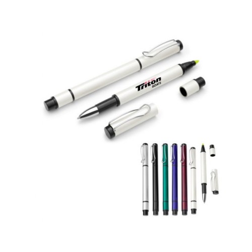 Descrição: Caneta plástica esferográfica e marca texto, inteira colorida com detalhes preto. Clip de metal, possui tampa de ambos lados. Obs.: Indiferente de cor, todos marca textos são amarelos.