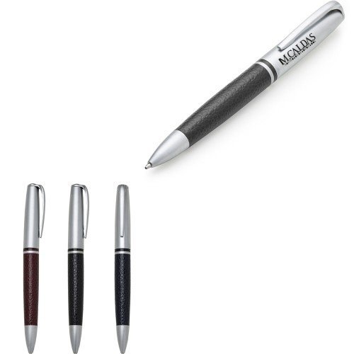 Descrição: Caneta metálica com acabamento brilhante e detalhe em couro sintético. Clipe metálico com a parte superior colorida e anel central preto. Carga esferográfica azul e acionamento por rotação.