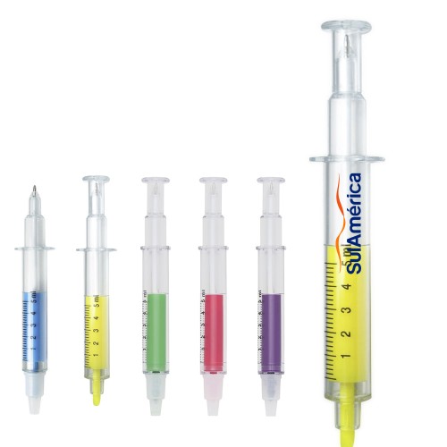 A caneta seringa marca texto personalizada é transparente, tem corpo em plástico, marca texto de diversas cores e tampa protetora. Personalize com sua marca gravada a laser e compre a partir de 200 unidades. Descrição: Caneta plástica em formato de seringa, esferográfica e marca texto. Possui medidor imitando uma seringa e tampa protetora nas duas pontas. Altura : 14,3 cm Largura : 2,7 cm Medidas aproximadas para gravação (CxL): 4 cm x 1,3 cm Peso aproximado (g): 15