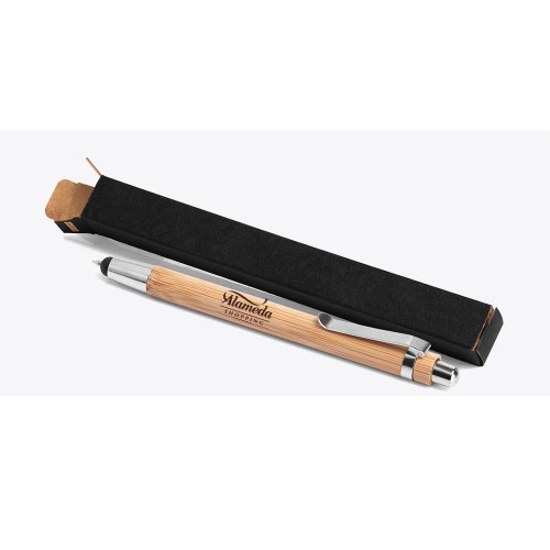 Descrição: Caneta Ecológica de Bambu com detalhes prata. Clip de metal, aciona por clique. Caneta esferografica em Bambu com ponta touch. Possui detalhes em plástico e ferro cromado; carga esferográfica azul, acionada com um click.
