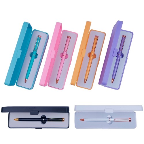 Descrição: Caneta metálica em estojo plástico com berço espumado, caneta branca com detalhes em bronze e caneta preta com detalhes em dourado, possui acionamento por rotação e carga esferográfica azul.