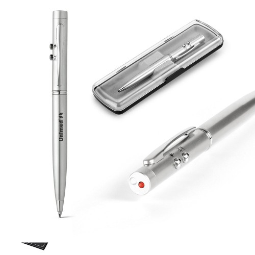 DA caneta é um produto clássico no mercado de brindes corporativos e se consolidou como uma excelente opção na estratégica de comunicação entre empresas, clientes, colaboradores e propects. A caneta 3 em 1 personalizada é um produto que certamente vai surpreender em seu evento ou ação promocional. Com corpo em metal disponível na cor prata, a caneta personalizada tem acessórios e detalhes cromados. Disponível com estojo, ela conta ainda com laser pointe e lanterna LED. Personalize com sua marca gravada a laser e compre a partir de 50 unidades. Esferográfica em metal. Com ponteira laser e LED. Incluso 3 pilhas LR41. Até 1,5 km de escrita. Fornecida em estojo com forro de veludo. ø10 x 131 mm | Estojo: 170 x 50 x 20 mm
