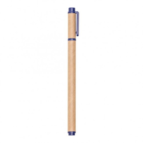 Descrição: Caneta ecológica roller. Caneta de material kraft com tampa, possui clip plástico colorido, anel e parte inferior plástica colorida.