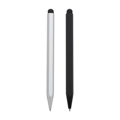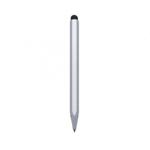 Descrição: Caneta metal com touch em formato hexágono(possui 6 lados). Possui borracha touch em uma ponta e no lado inferior caneta esfero, para acioná-la basta segurar a ponteira e rotacionar o corpo da caneta. Medidas aproximadas para gravação (CxL): 4 cm x 0,5 cm Tamanho total aproximado (CxL): 13,4 cm x 1,5 cm