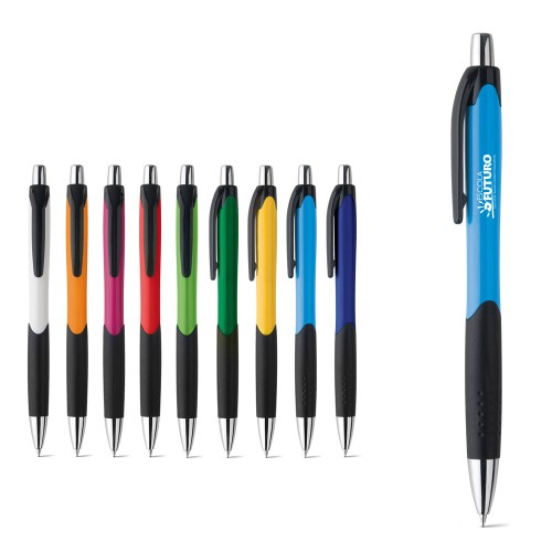 . Esferográfica em ABS com grip, acabamento brilhante e ponteira cromada. Até 1,5 km de escrita. ø10 x 138 mm