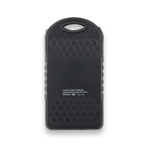 Bateria portátil solar em ABS com painel solar e LED. Bateria de lítio com capacidade de 2.000 mAh, entrada/saída 5V/1A e 2 portas USB. Incluso cabo USB / micro USB para carregar a bateria. Fornecida em caixa presente. 143 x 77 x 16 mm | Caixa: 165 x 80 x 20 mm.
