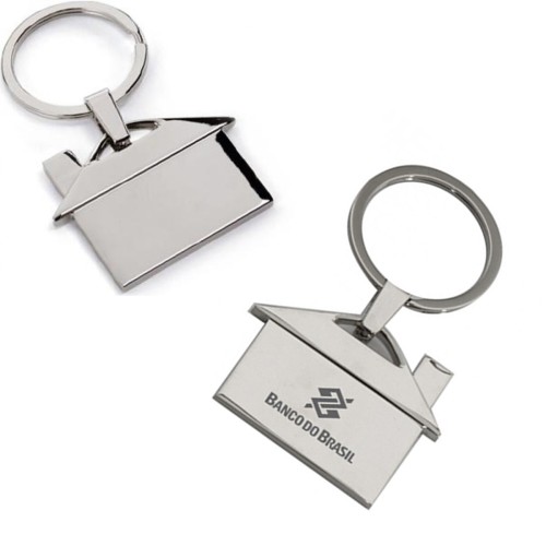Descrição: Chaveiro metal brilhante formato casa, frente e verso da chapa liso.