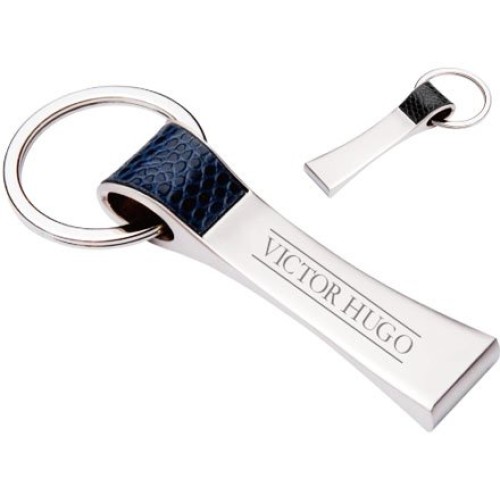 Descrição: Chaveiro de metal fosco com detalhe em couro sintético texturizado. Frente e verso liso.
