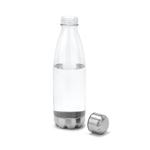 Descrição: Squeeze plástico 700ml formato garrafa. Corpo transparente colorido, possui tampa e base em alumínio. Altura : 25,5 cm Largura : 7,1 cm Circunferência : 22,5 cm Medidas aproximadas para gravação (CxL): 13,5 cm x 6 cm Peso aproximado (g): 88