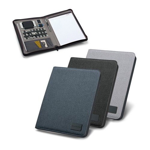 Procura um produto diferenciado para seu evento? Fabricada em linho sintético e couro sintético, na cor cinza, azul ou preto, em tamanho A4 e com placa metálica com acabamento emborrachado, a pasPasta A4 em linho sintético e c. sintético com placa metálica com acabamento emborrachado. No interior, contém um bloco (20 folhas pautadas), suporte para esferográfica (não inclusa) e outros compartimentos para acessórios (não inclusos). 259 x 336 x 27 mm | Placa: 50 x 30 mmPasta A5 em linho sintético e c. sintético com fecho magnético. No interior, contém um bloco (20 folhas pautadas), suporte para esferográfica (não inclusa) e outros compartimentos para acessórios (não inclusos). 183 x 252 x 18 mm | Placa: 50 x 30 mm