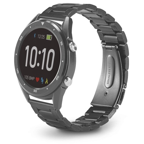 O THIKER I é um sofisticado relógio inteligente resistente à água com bracelete em aço inox e transmissão por bluetooth 4.2 (compatível com versões iguais ou superiores Android 5.0 e iOS 9.0). O THIKER I é um aliado para o dia-a-dia através de múltiplas funcionalidades: pedómetro, acesso a notificações e conexão à playlist do dispositivo móvel, monitorização do sono, frequência cardíaca, geolocalizador, despertador, entre outras. Tem uma resolução de tela de 240 x 240 px, capacidade de 230 mAh e autonomia em uso até 72 horas e em standby até 7 dias. Fornecido em caixa presente. 26 x 47 x 8 mm | Caixa: 120 x 120 x 70 mm.