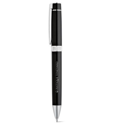 Conjunto de roller e esferográfica com mecanismo twist, ambos em metal e com clipe. Esferográfica até 2km de escrita. Fornecida em estojo almofadado. ø12 x 132 mm | Estojo: 170 x 70 x 30 mm.