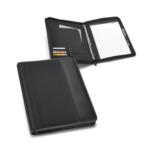 Procura um produto diferenciado para seu evento? Fabricada em couro sintético e microfibra, na cor preta, a pasta convenção personalizada é uma ótima dica de brinde promocional para seus clientes e colaboradores. Super útil, ela possui quatro argolas de 20 mm para folhas A4 e vem com bloco de 20 folhas pautadas, além de espaço para caneta, cartões e elástico para acomodar outros pertences. Personalize com sua marca gravada em serigrafia e compre a partir de 50 unidades.