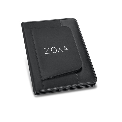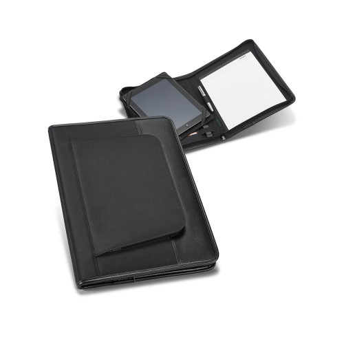 Pasta A4 em c. sintético e microfibra. Bolso exterior com zíper, interior com suporte para tablet (10.1'' e 7'') e bloco com 20 folhas pautadas. Esferográfica e pen drive não inclusas. 255 x 350 x 30 mm.