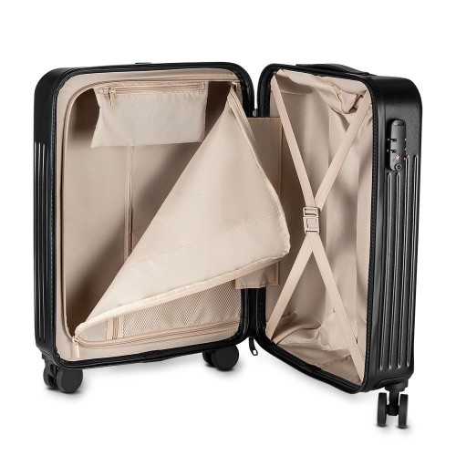 Mala de viagem em ABS e interior em 210D Abertura frontal com ziper para acesso ao interior da mala; Saida USB ideal para carregamento de smartphones; Sistema de carrinho de aço; Cadeado com senha/segredo; Possui cadeado TSA; Alça de mão na parte superior Quatro rodas de 360 graus; Acompanha Plaquinha de metal (5,9x1,9cm) sem personalização.
