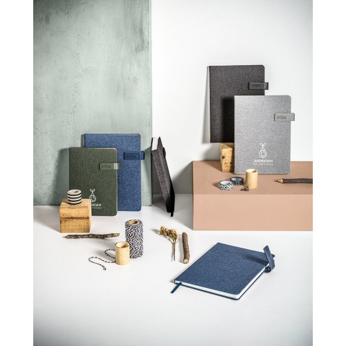 Agenda com presilha em PU com fecho magnético e suporte para esferográfica (não inclusa).