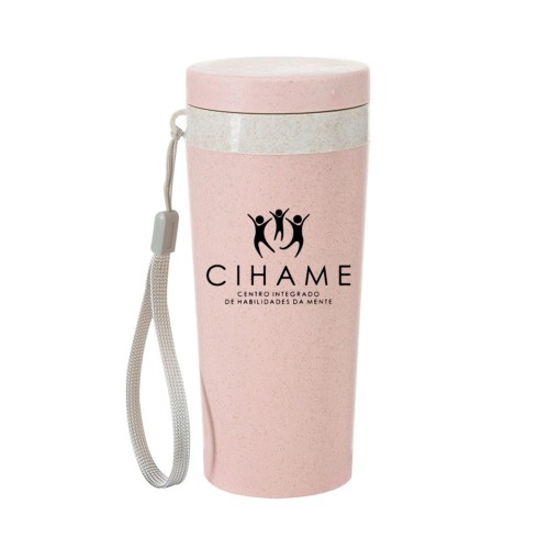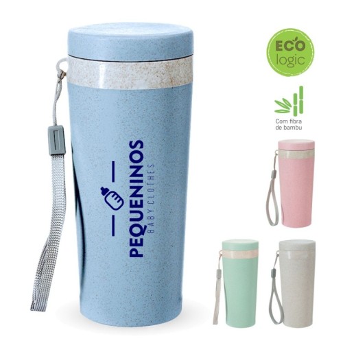 Descrição: Copo fibra de bambu 350ml com parede dupla e alça. Copo produzido em Polipropileno livre de BPA, possui uma tampa de vedação rosqueável e alça de nylon (removível) para transporte. Conserva a temperatura interna durante um período de 1 à 2 horas, mas não dispõe de isolamento térmico. O copo pode ser levado a lava-louças, geladeiras e micro-ondas.