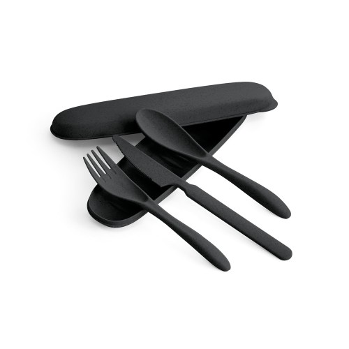 Conjunto de 3 talheres em fibra de bambu (50%) e PP (50%) com garfo, faca e colher. Incluso estojo. Food grade. 205 x 65 x 25 mm.