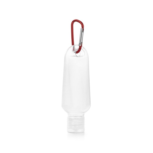 Frasco PETG de 50 ml com tampa flip top e mosquetão. Indicado para colocar álcool gel. 45 x 120 mm.