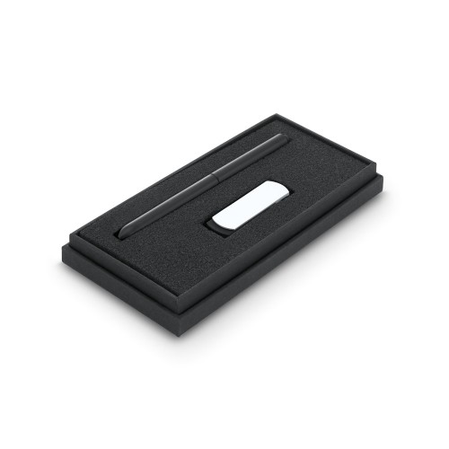 Fornecida em caixa presente. Esferográfica: ø10 x 138 mm | Pen drive: 55 x 17 x 10 mm | Caixa: 92 x 175 x 22 mm