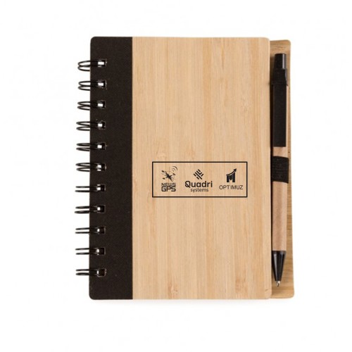 Com capa feita em casca de bambu e faixa vertical colorida, ele conta também com encadernação Wire-O e aproximadamente 70 folhas amareladas pautadas. Além disso, o caderno acompanha uma caneta esferográfica de carga azul de 0,8 mm com corpo em papelão e clip, acionamento em clique e ponteira em plástico.