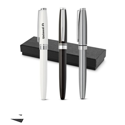 Além de serem produtos super úteis e de custo acessível, as canetas personalizadas são perfeitas para diversas situações como feiras, convenções, promoções e eventos em geral. Cheia de estilo, a caneta metálica personalizada está disponível nas cores prata, pérola ou preta, tem tampa e acompanha estojo premium almofadado.