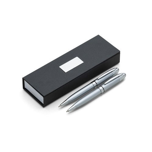 Descrição: Conjunto caneta e lapiseira em estojo de cartonagem com placa central para personalização. Clip metal e anel central possui: anel fino prata, anel preto fino e um anel maior prata com relevo e acionam por giro. Estojo revestida com espuma na parte interna. Largura : 6,5 cm Comprimento : 18 cm Medidas aproximadas para gravação (CxL): Caneta/Lapiseira 3,7 cm x 1,2 cm – Estojo 4,1 cm x 1,6 cm Tamanho total aproximado (CxL): Caneta/Lapiseira 14 cm x 1,6 cm Peso aproximado (g): 130