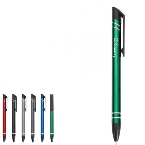 Descrição: Caneta semimetal colorida com anéis prata e detalhes em preto. Clip plástico preto, possui quatro anéis, sendo dois superiores e dois inferior. Aciona por clique.