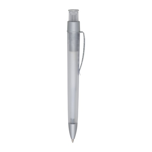 Descrição: Caneta plástica fosca inteira colorida com detalhes prata. Clip de metal com doze furos, aciona por clique.