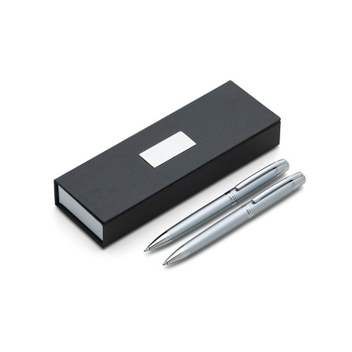 Descrição: Conjunto caneta e lapiseira em estojo de cartonagem com placa central para personalização. Clip metal e anel central possui: anel fino prata, anel preto fino e um anel maior prata com relevo e acionam por giro. Estojo revestida com espuma na parte interna. Largura : 6,5 cm Comprimento : 18 cm Medidas aproximadas para gravação (CxL): Caneta/Lapiseira 3,7 cm x 1,2 cm – Estojo 4,1 cm x 1,6 cm Tamanho total aproximado (CxL): Caneta/Lapiseira 14 cm x 1,6 cm Peso aproximado (g): 130