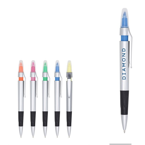 Descrição: Caneta plástica esferográfica e marca texto com corpo prata. Possui tampa protetora no marca texto e detalhe emborrachado com relevo na parte inferior. Aciona por clique.