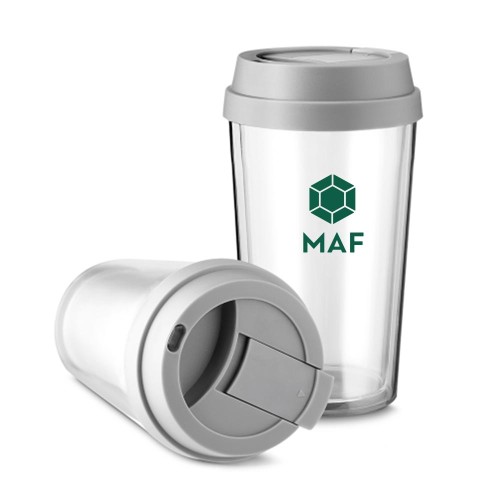 Copo plástico parede dupla com tampa 400ml, plástico utilizado AS (Estireno de acrilonitrilo) Dimensão do Produto: 14,5xø9,0cm Peso do produto: 0,146kg