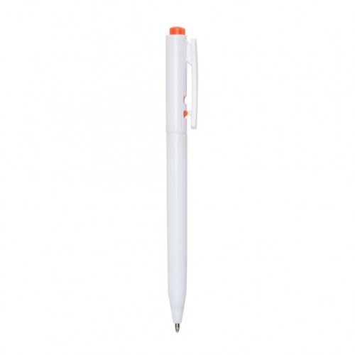 Descrição: Caneta plástica leitosa com detalhe colorido. Acionador com detalhes em relevo e clip plástico, aciona por clique e para destravar basta apertar a parte inferior do clip.