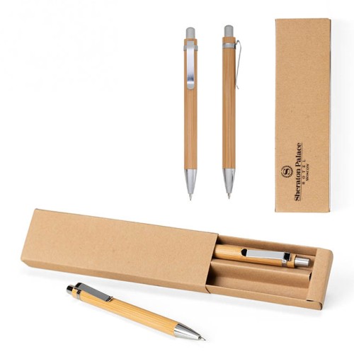 Descrição: Kit ecológico caneta e lapiseira em bambu com estojo de papelão. Caneta bambu com clip metálico, aciona por clique. Lapiseira bambu com clip metálico, aciona por clique.